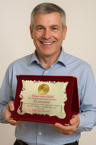 Targa Pensione | Targhetta Pensionato Pronta da regalare | Pensiero pensionato cofanetto bordeaux e targhetta dorata